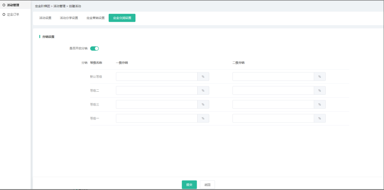 (4)营销设置和分润可设置活动定金的营销及分润信息,相应插件如未开启,则无法     设置,分润中所有插件都没开启则不会有分润设置导航;